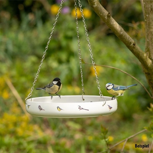 Wenn Sie Vögeln Wasser anbieten möchten, ist diese Porzellan-Wasserschale einfach ideal. Sie wird mit einer Kette geliefert, sodass Sie sie problemlos an einen Baum oder Haken hängen können.