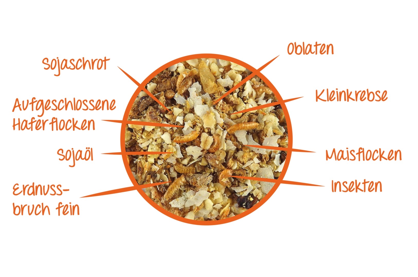 Zusammensetzung: Weich- und Krebstiere (21%), Bäckereierzeugnisse (ungesüßte Oblaten und Waffeln), Saaten, Getreide, Pflanzliche Nebenerzeugnisse, Sojaöl, Nüsse, Früchte, Insekten, Mineralstoffe