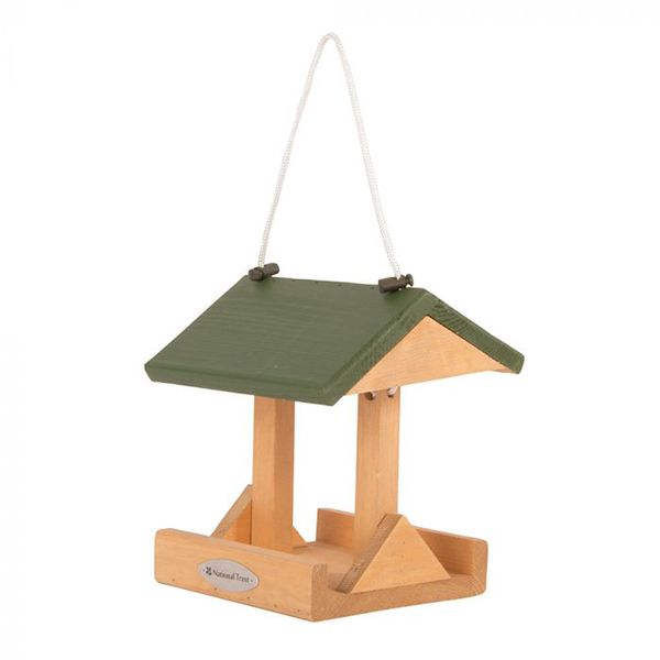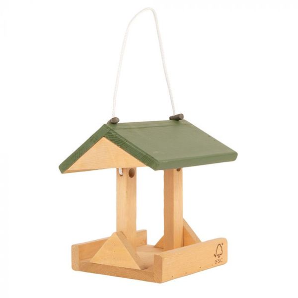 Dieser Holzfutterautomat hat ein grünes Dach und einen Tisch darunter, um heruntergefallene Lebensmittel aufzufangen. Der Tisch wird auch als Sitzstange verwendet, um sicherzustellen, dass Gartenvögel sicher fressen können und einen guten Blick auf ihre Umgebung haben.