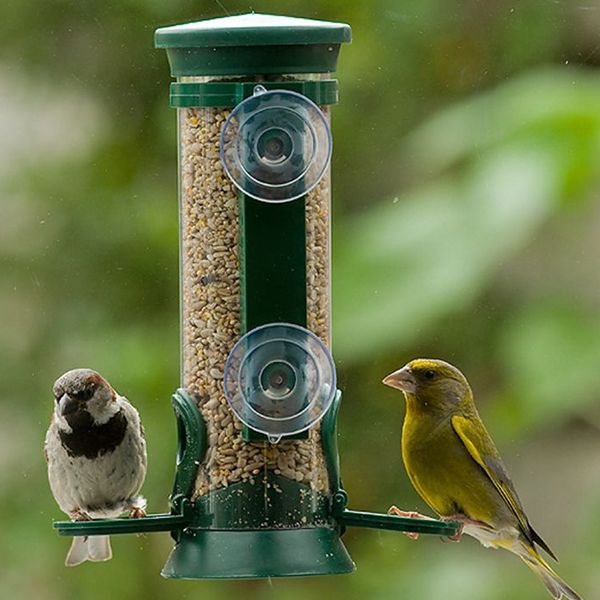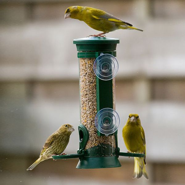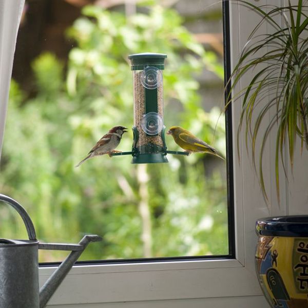 Die Samen-Säule "Discovery" aus Kunststoff besitzt 2 Futteröffnungen und lässt sich mit Saugnäpfen an der Fensterscheibe befestigen.