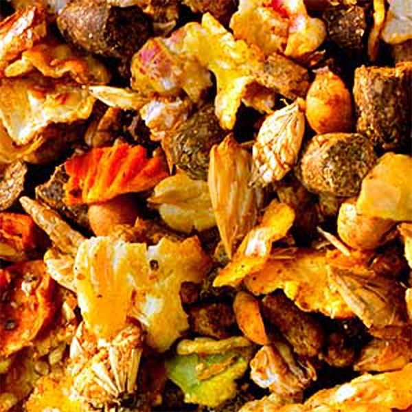 Zusammensetzung: Maisflocken, Gersteflocken, Leinsamenfaser, Weizenflocken, Soja-extr.schrot aus geschälter Saat dampferhitzt, Sojabohnen dampferhitzt, Leinkuchen, Appelmelasse, Gerste, Maiskleberfutter, Rapsextraktionsschrot, Johnannisbrotmehl, Erbsenflocken, Soja Öl, Lecithin, gepuffte Weizen, Möhrenflocken getrocknet, Kalksteine, organische Säuren