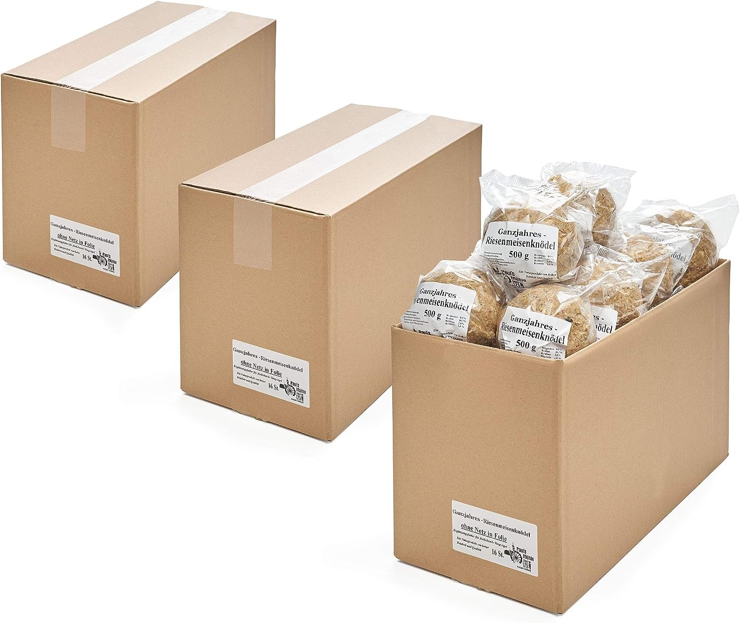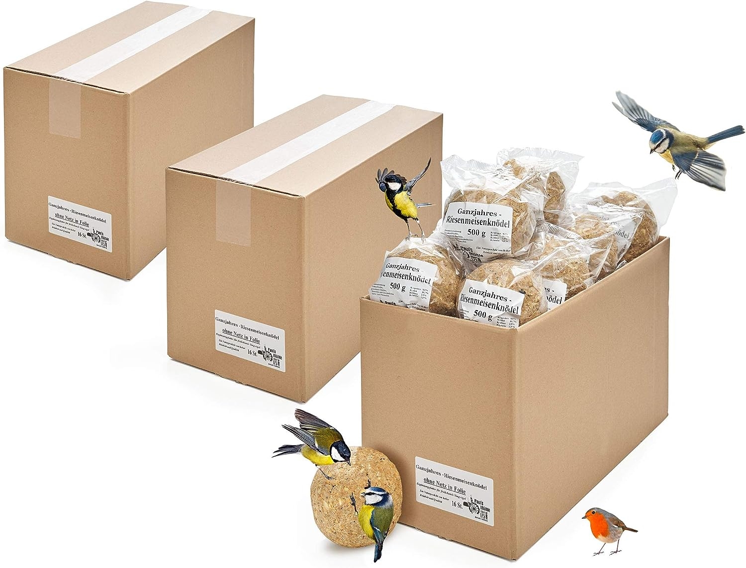 Lieferumfang: 3 Kartons mit jeweils Ganzjahres-Riesenmeisenknödeln, ohne Netz, zur besseren Lagerung und Hygiene in Folie verpackt