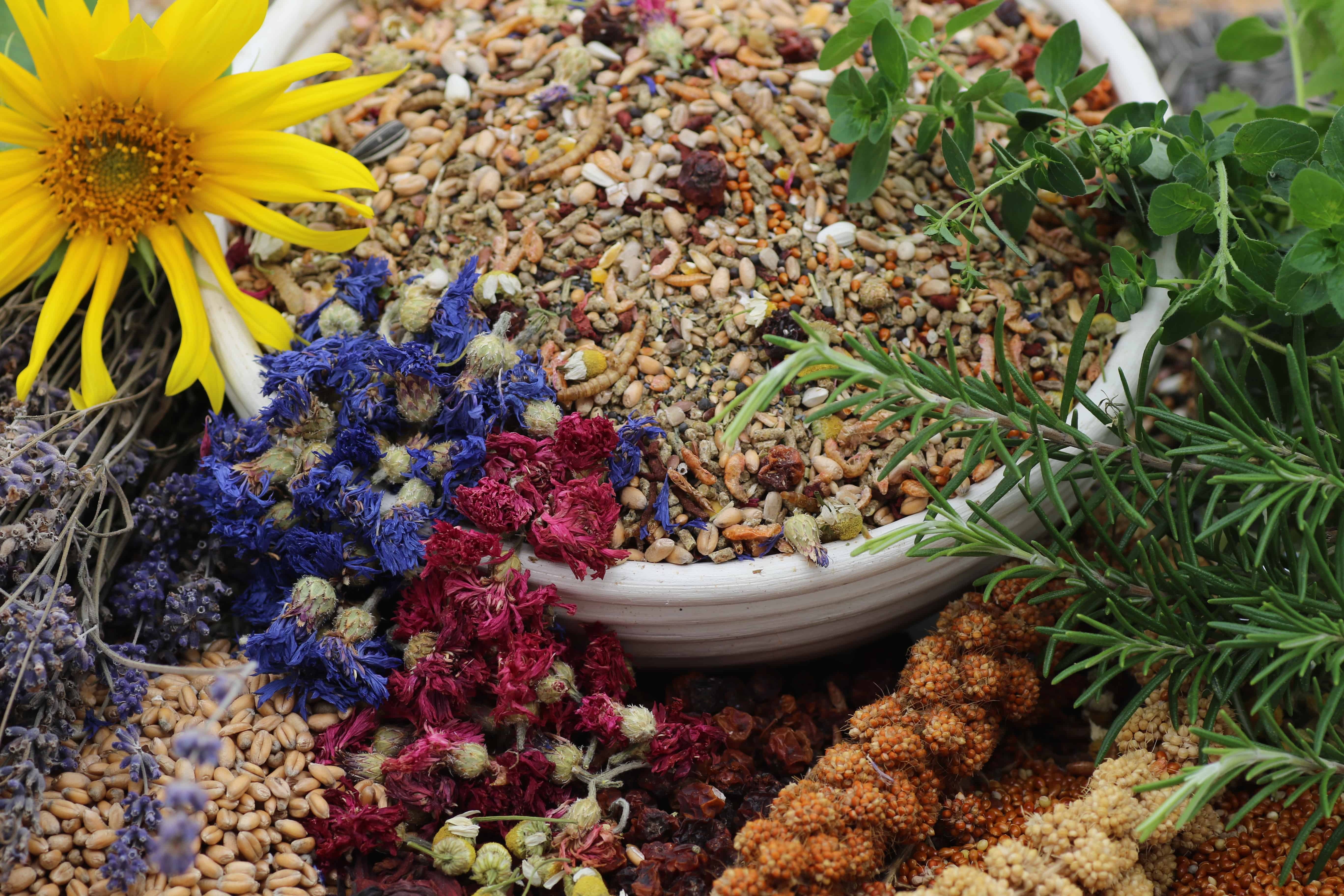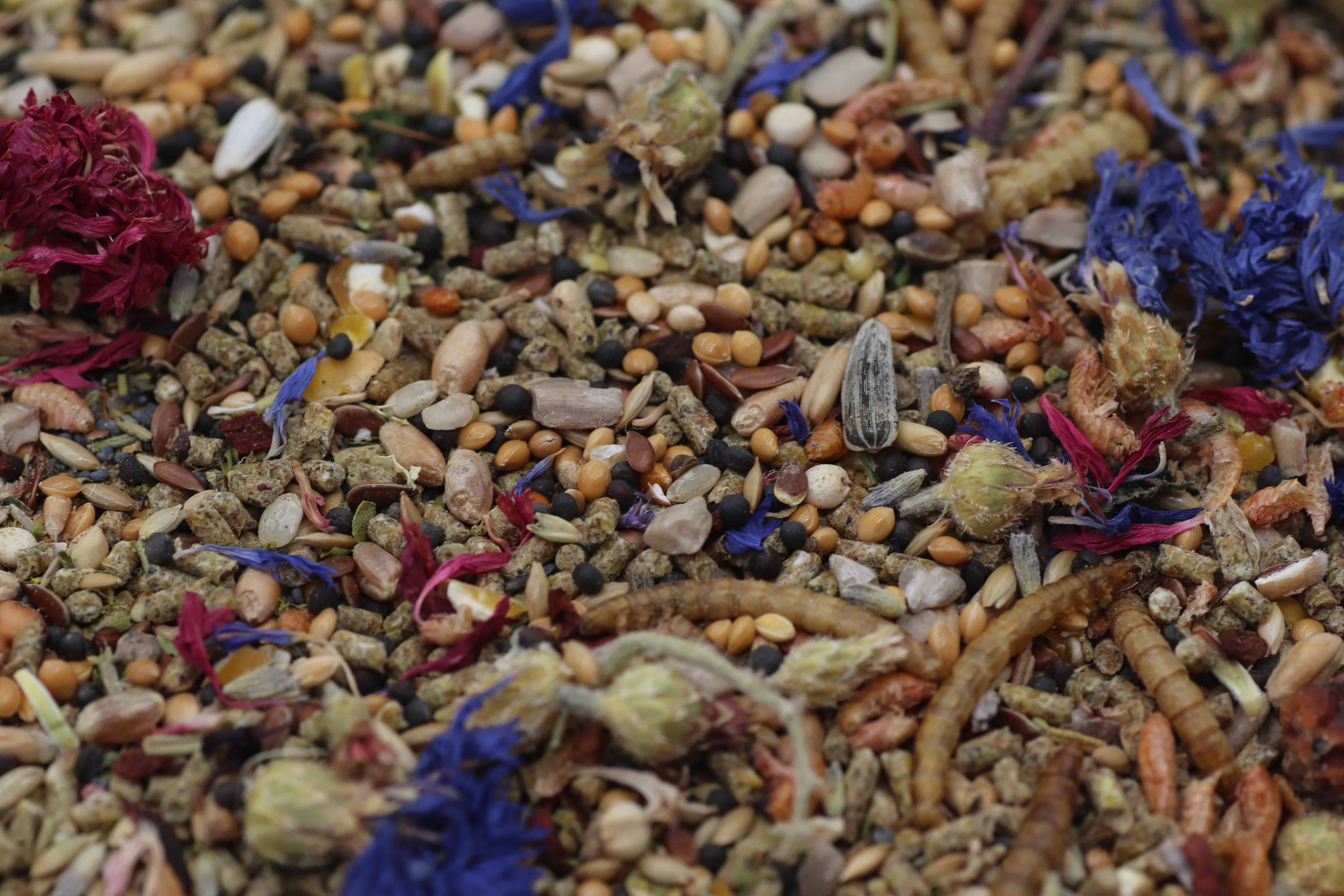 Zusammensetzung: Pellets (Mais, Soja-extr.schrot aus geschälter Saat dampferhitzt, Weizen, Maiskleberfutter, Luzernegrünmehl, Soja Öl, Bierhefe, Muschelgritt, Lecithin, organische Säuren), Weizengrütze, Mais gebrochen, Milo, Hafer Geschält, Erbsenbruch, Taubenweizen, Kanariensaat, Hirse, Raps, Rübsen, Leinsaat, Dari, Nackthafer, Halbrohreis, Kanariensaat, Kardisaat, Hanfsaat, Blaumohn, Ebereschenbeeren (Vogelbeeren), Sesamsaat, Grassamen, Spinatsamen, Radieschensamen, Mehlwürmer, Bachflohkrebse, Bierhefe, Sonnenblumenkerne gehackt, Vogelgrit, Oregano, Rosmarin, Rote Beete, Kamille, Lavendel, Kornblumen rot, Kornblumen blau, Pfefferminzblätter, Hibiskus
