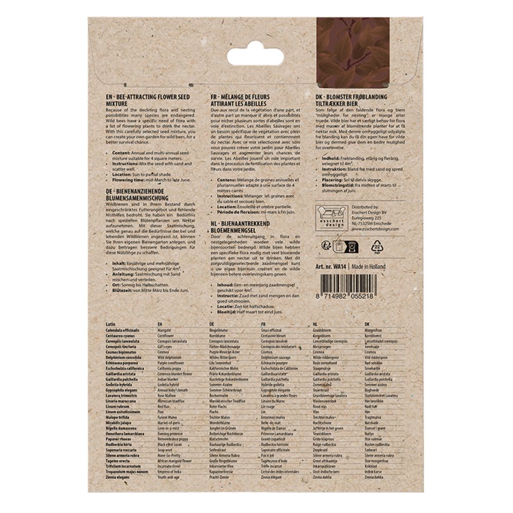 Viele Wildbienenarten sind vom Rückgang der Flora und der Nistbedingungen bedroht. Wildbienen brauchen eine bestimmte Flora mit vielen Blütenpflanzen, um Nektar zu trinken. Mit dieser sorgfältig ausgewählten Samenmischung können Sie Ihren eigenen Bienengarten anlegen und dazu beitragen, dass bessere Bedingungen für diese Nützlinge geschafft werden.